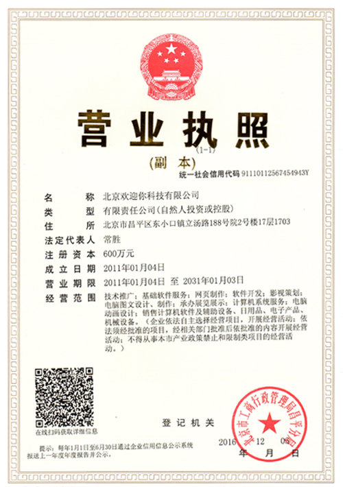北京歡迎你科技有限公司獲得多項(xiàng)版權(quán)局"計(jì)算機(jī)軟件著作權(quán)登記證書",并已獲得“全國誠信經(jīng)營示范單位”、“全國質(zhì)量服務(wù)客戶滿意誠信企業(yè)”和“全國重合同守信用品牌企業(yè)”等榮譽(yù)稱號(hào)。